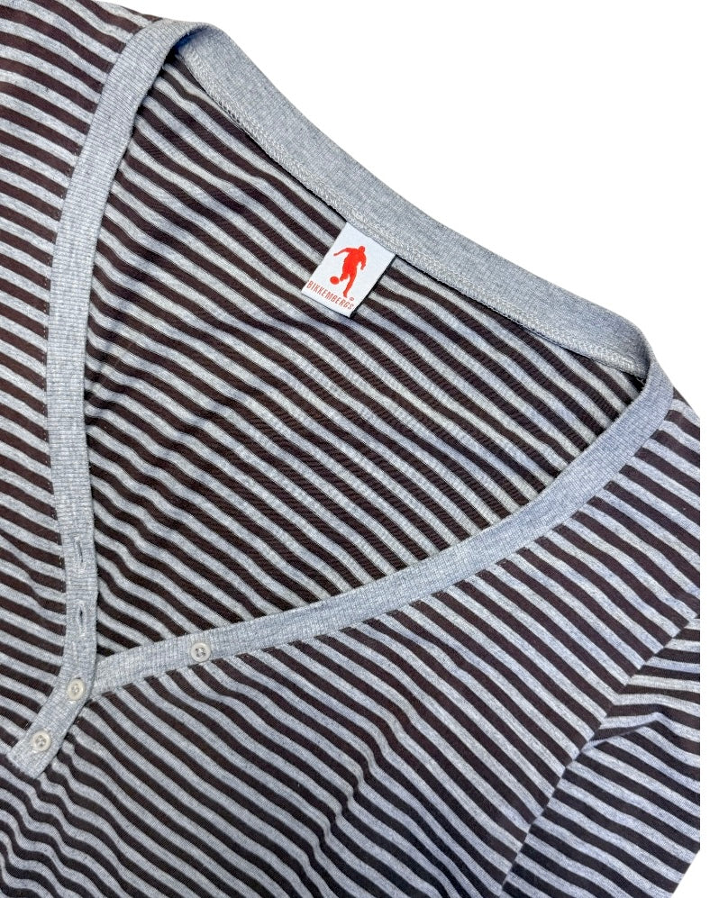 Vintage long-sleeve top from Bikkembergs. Lightweight cotton jersey with a narrow horizontal stripe pattern. Designed with a V-neck buttoned placket, contrast rib trim and asymmetric cuffs with a solid grey panel and small printed graphic detail.
