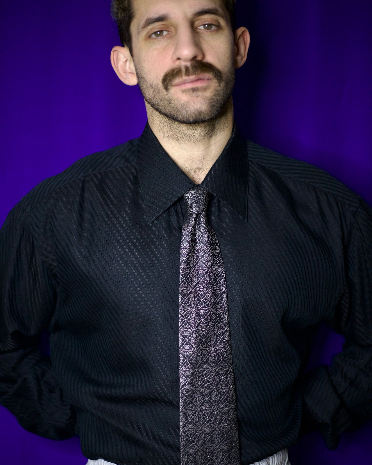 This Kenzo Paris tie features an all over geometric pattern in black with silver detailing. The contrast is subtle but graphic and gives the tie a sharp edge without feeling loud.