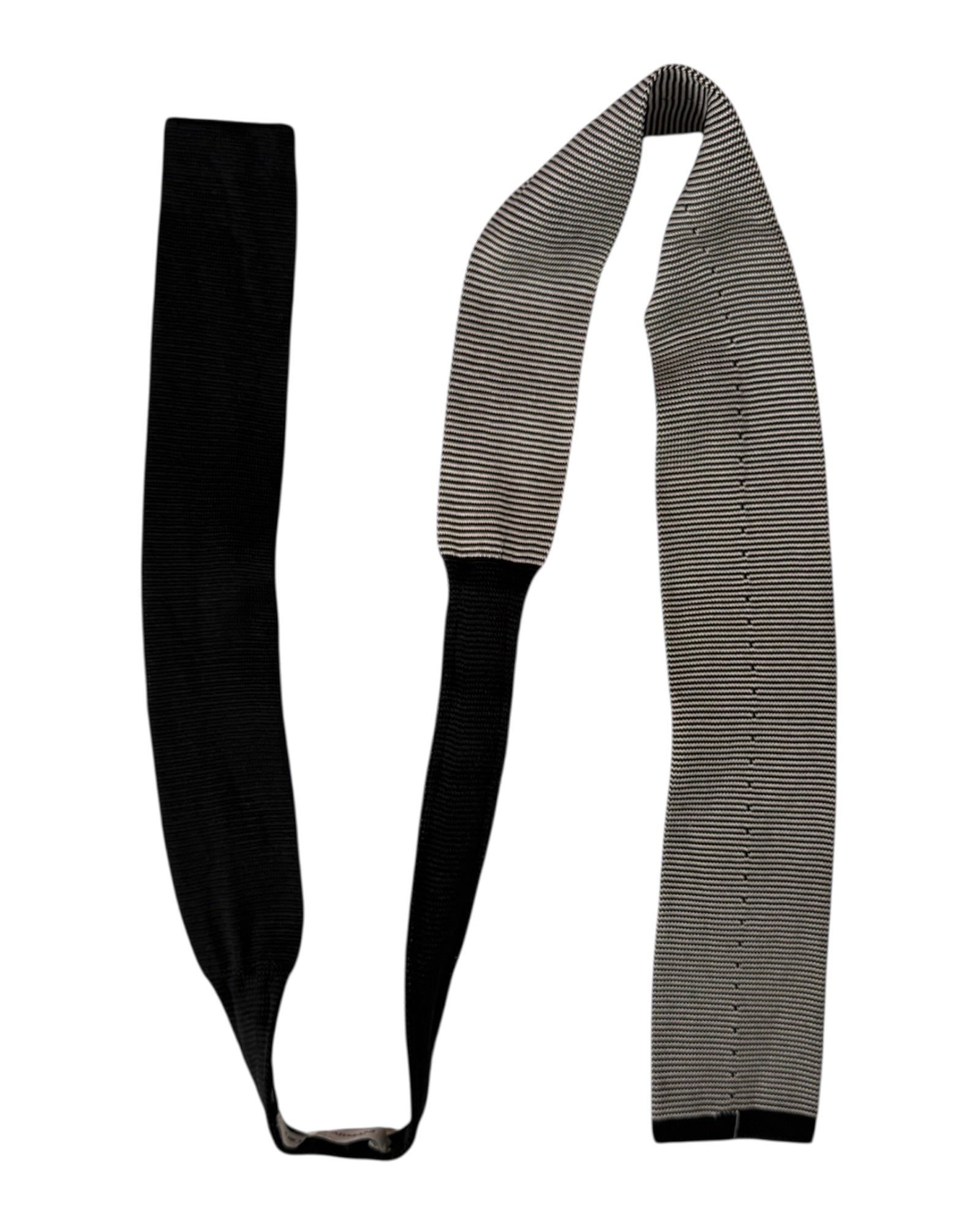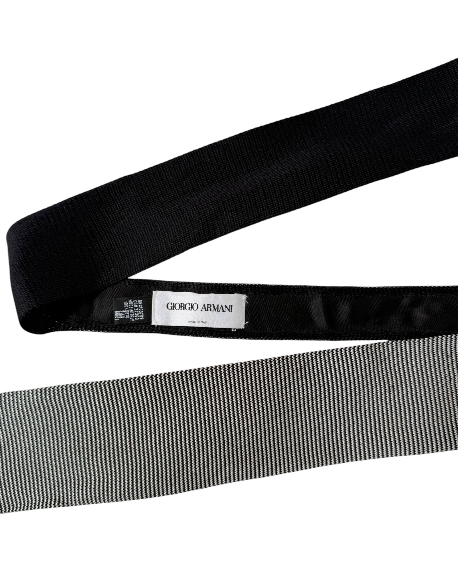 Giorgio Armani knitted silk tie in navy and white with a fine striped pattern. Textured knit with a clean, structured finish.