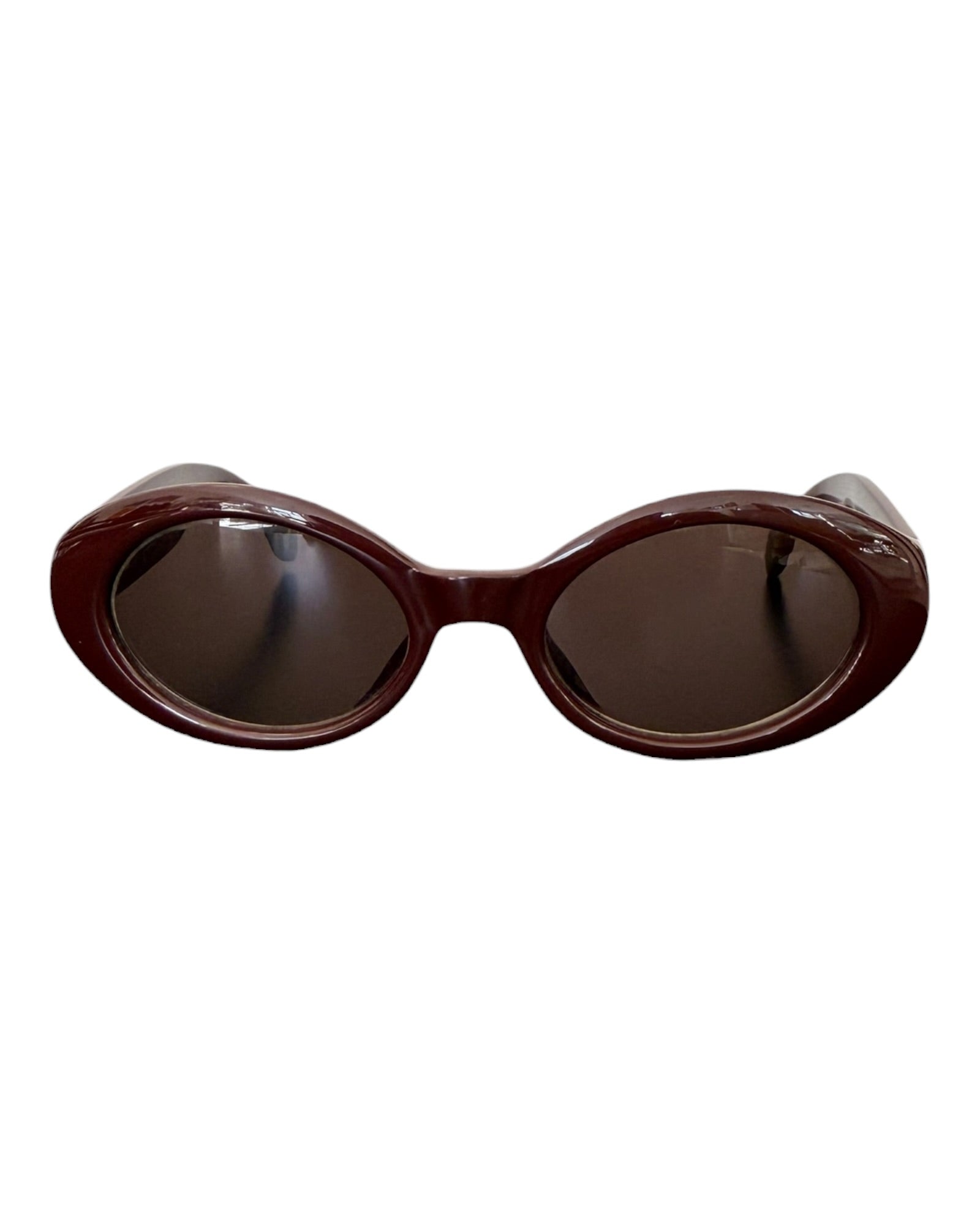 Max Mara vintage oval sunglasses in brown with tinted lenses. Compact frame with a narrow, sculpted profile and a close-fitting silhouette. The proportions create a sharp, controlled look typical of early 2000s eyewear.