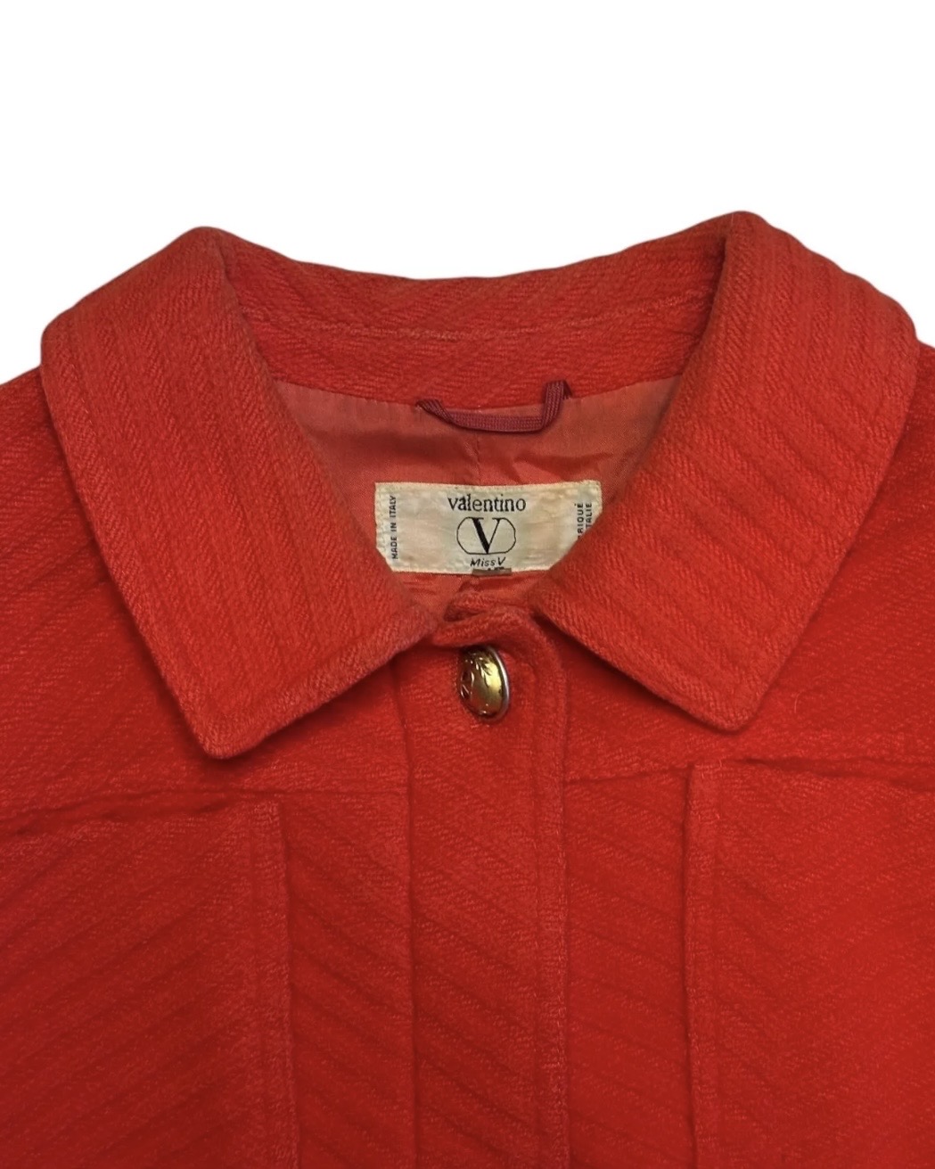 Striking vintage red A-line coat from Miss V by Valentino, dating to the 1990s. This structured jacket features a button-up front, gathered balloon sleeves, and pleated detailing throughout. Finished with a rounded collar and practical side pockets, it embodies the bold and elegant tailoring of the Miss V line.