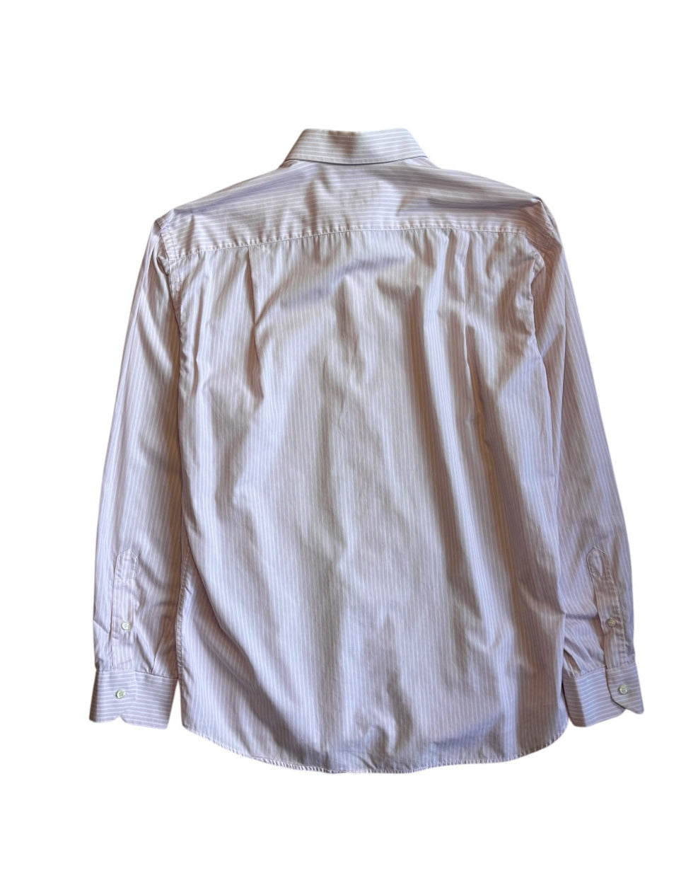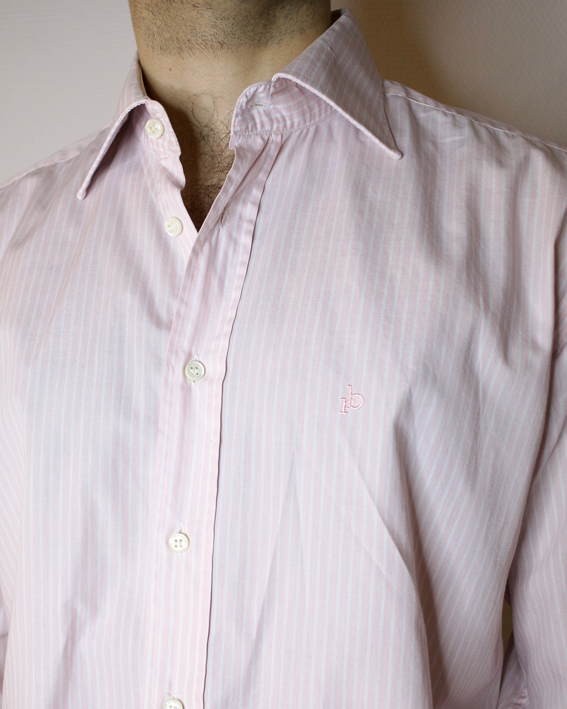 Vintage Roccobarocco shirt featuring pink and white vertical stripes in a lightweight cotton blend. Designed with a classic pointed collar and a relaxed tailored silhouette. Marked size 41 and best suited for a modern Large depending on styling. A clean and versatile piece with subtle colour detail.