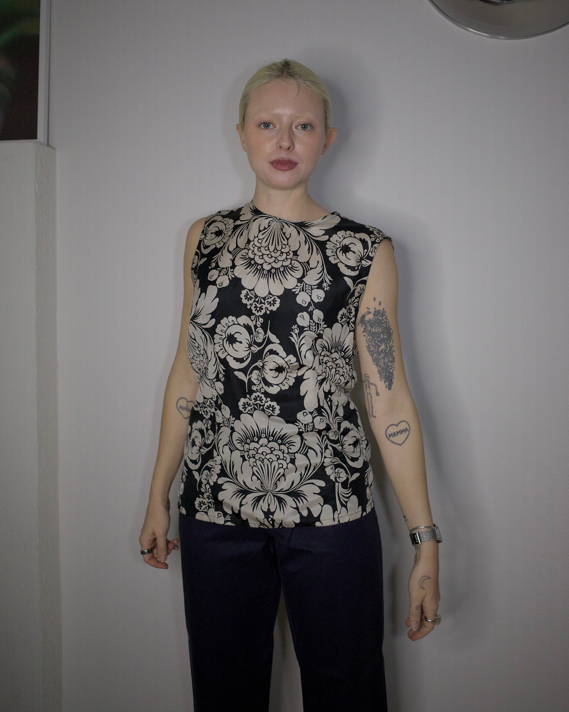 Vintage Gianni Versace silk top from the early to mid 1990s. Crafted in Italy from 100 percent silk, this piece features a bold black and white baroque floral print characteristic of the era. The sleeveless cut and clean neckline create a refined silhouette that pairs easily with tailored trousers or structured skirts.