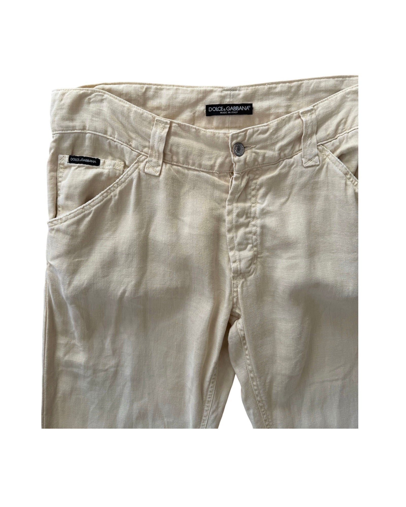 Classic linen trousers from Dolce & Gabbana in a soft neutral tone. Features a mid-rise waist, relaxed fit through the hips, and a straight-leg silhouette. Ideal for warm weather styling with loafers or sandals. Tagged size 48, fits closer to a modern 34 x 34.