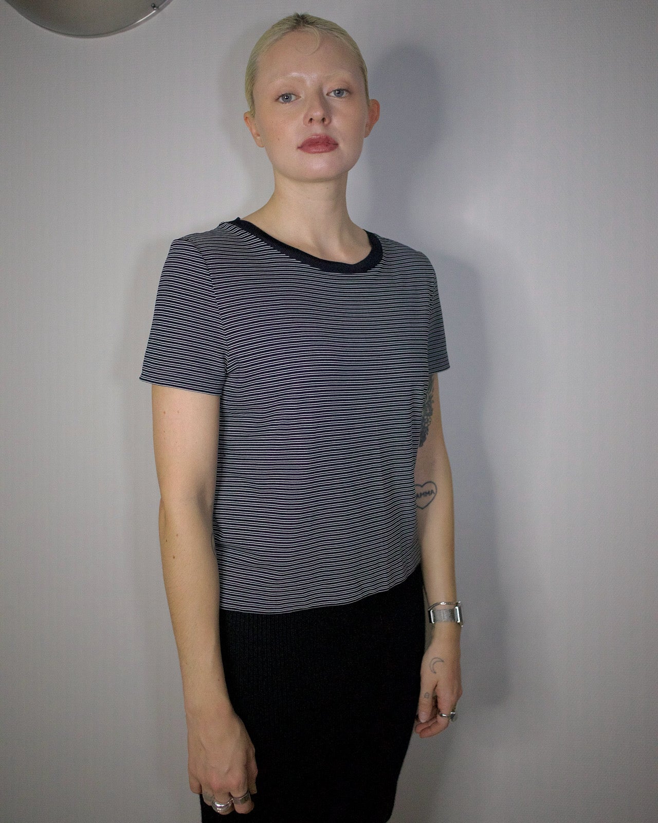 Vintage Marella short-sleeve top from the early 2000s, crafted from a soft rayon and polyester blend. The piece features black and white stripes with a clean crew neckline and a fitted silhouette. A polished everyday basic produced under the Max Mara Fashion Group with the smooth drape characteristic of rayon knits.