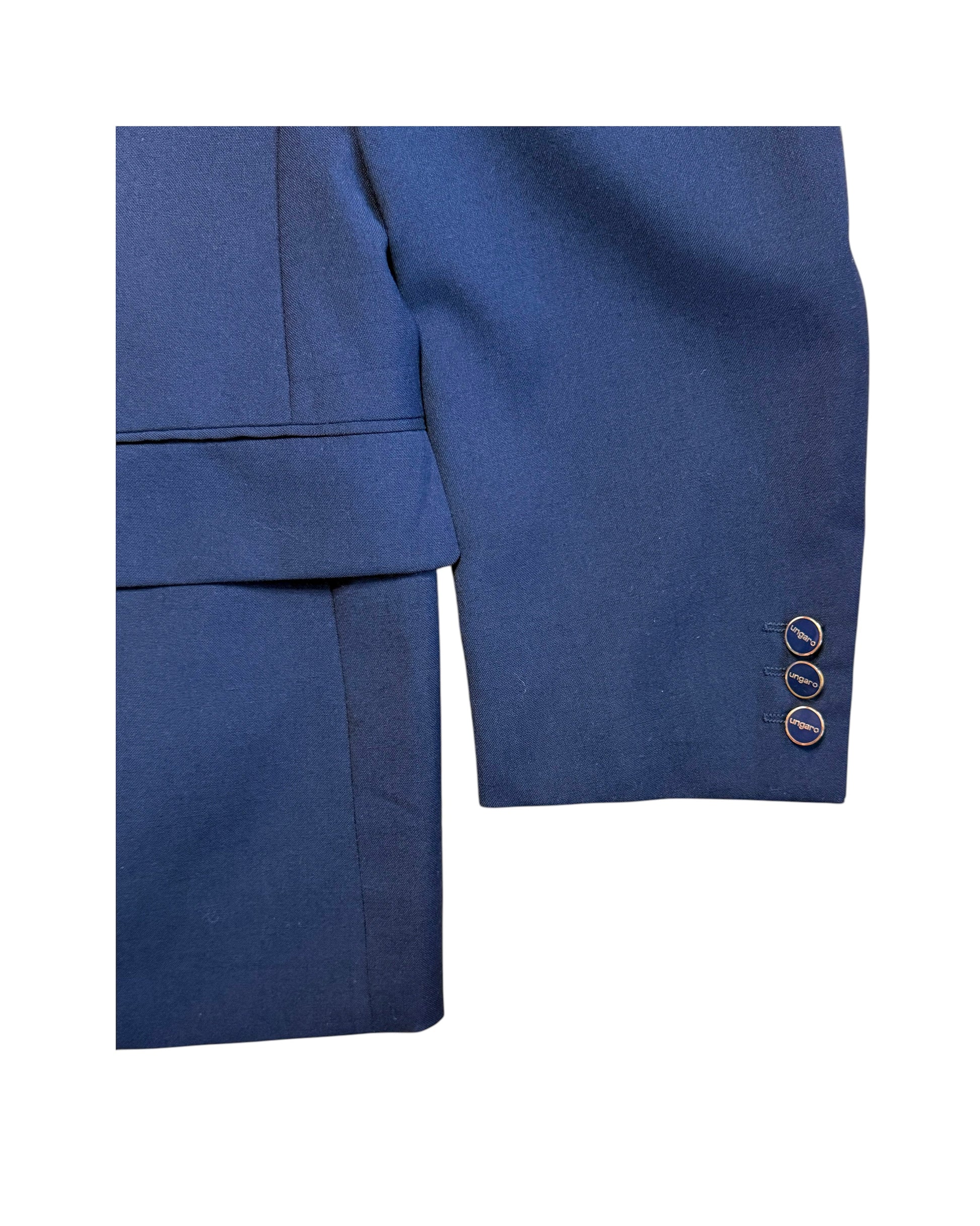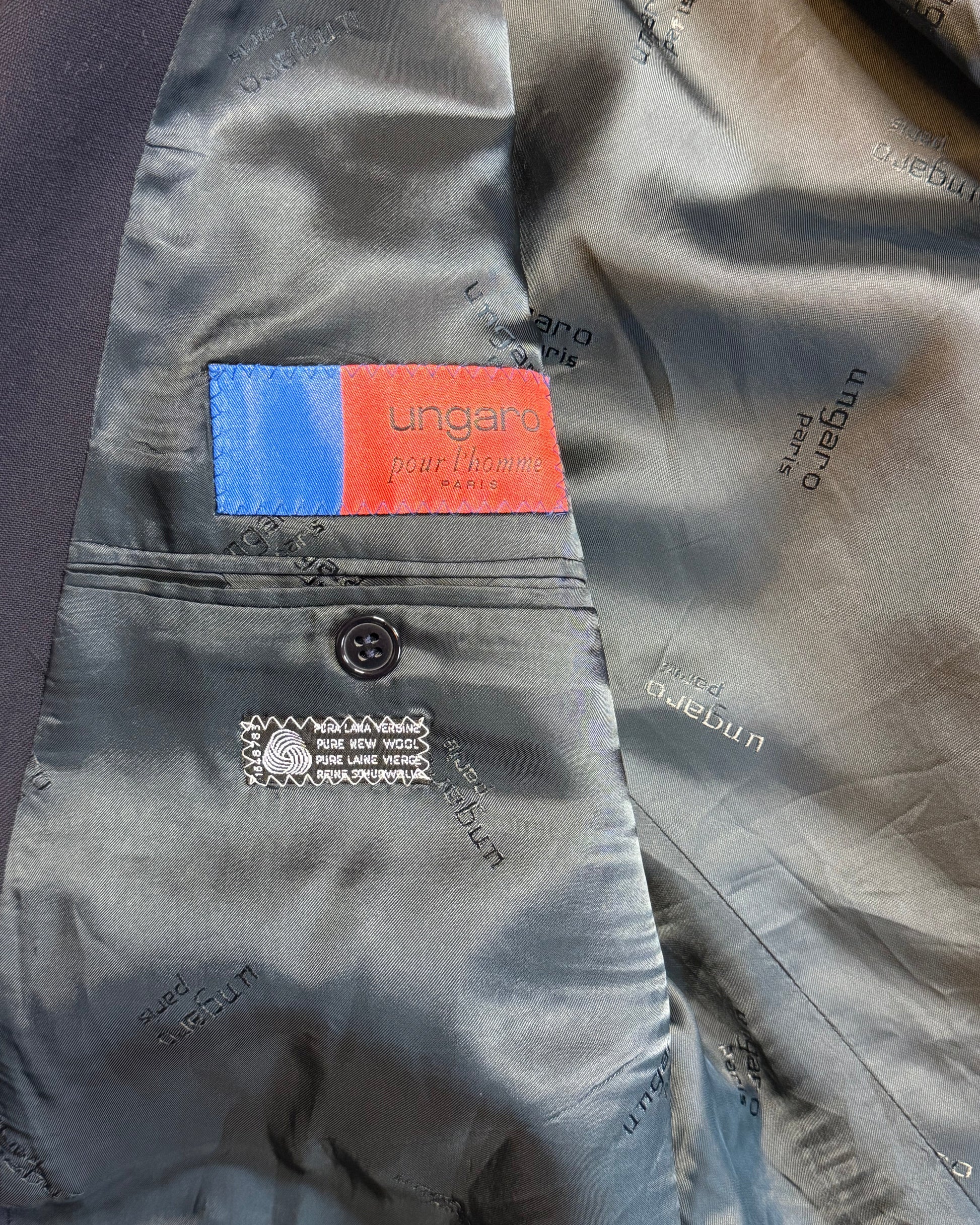 Vintage Ungaro pour l’Homme Paris blazer in navy pure wool. Features a double breasted front with wide peak lapels and light shoulder structure. Fully lined in Ungaro Paris satin with interior pockets. This style comes from the mid nineties to early two thousands and has a lighter construction than earlier Ungaro tailoring. Marked size L and best suited for a modern Large.