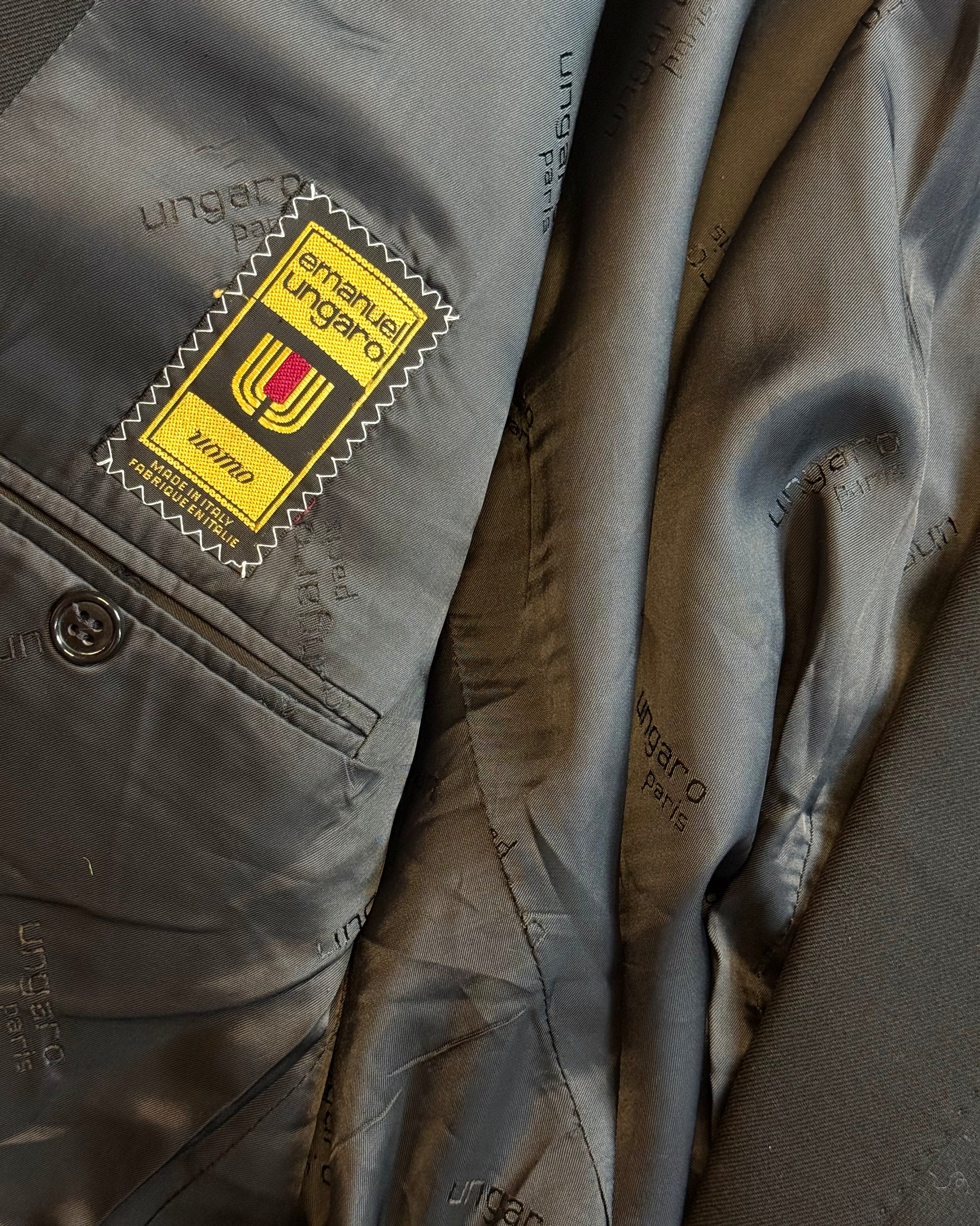 Vintage Ungaro Uomo blazer from the late eighties to early nineties in a deep black wool blend. The jacket has structured shoulders, a classic notch lapel, and a clean two button front. It is fully lined with Ungaro Paris monogram fabric and has a strong tailored construction that reflects this earlier period of Ungaro menswear. Marked size 52 and best for a modern Large to Extra Large depending on desired fit.
