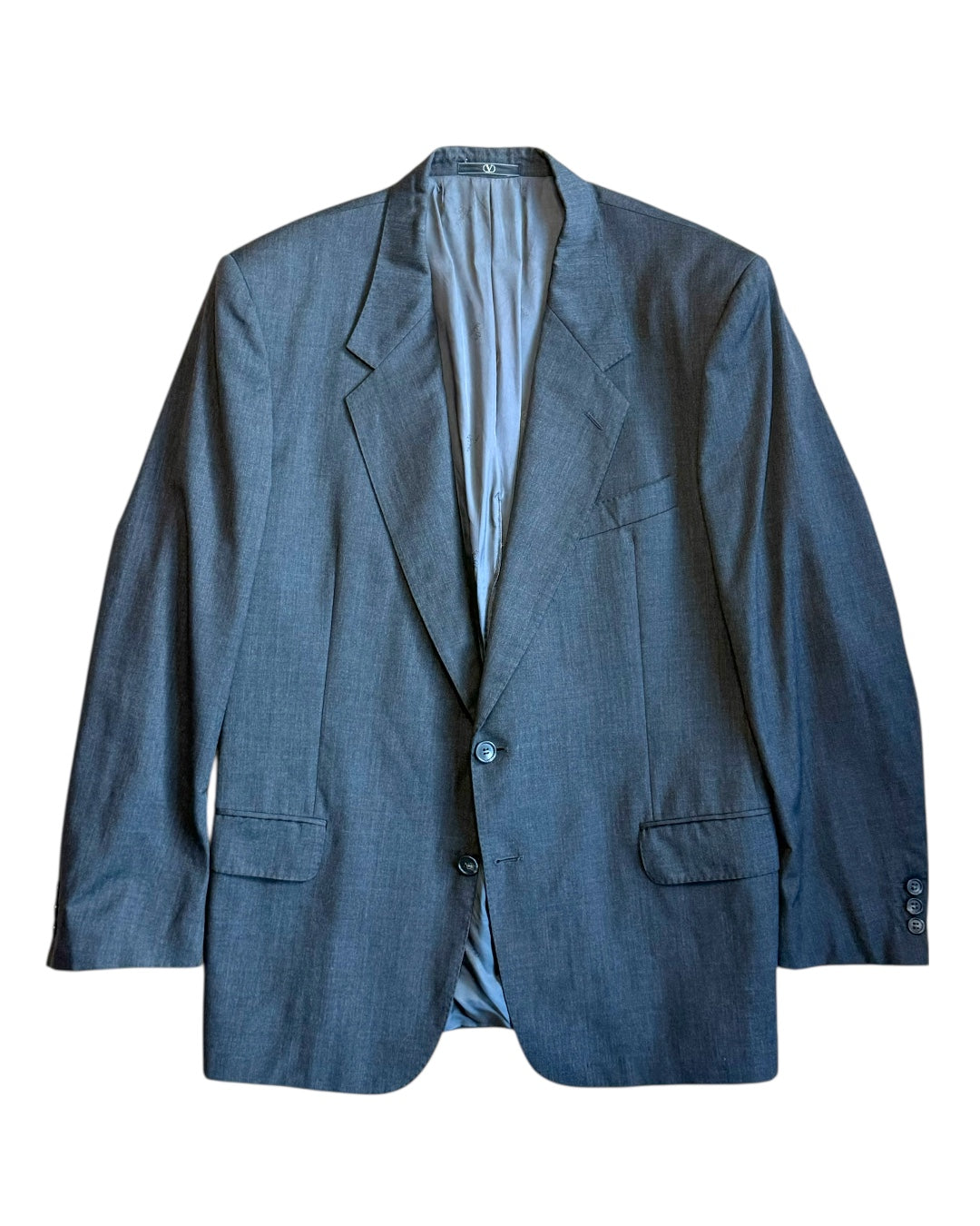 Vintage Valentino Uomo blazer from the mid to late nineties, tailored in a clean grey wool. The jacket features structured shoulders, a classic notch lapel and a sharp two button closure. Fully lined with Valentino monogram satin and finished with interior pockets. A refined example of minimalist Italian menswear from this era. Marked size 52 Regular and best suited for a modern Large.