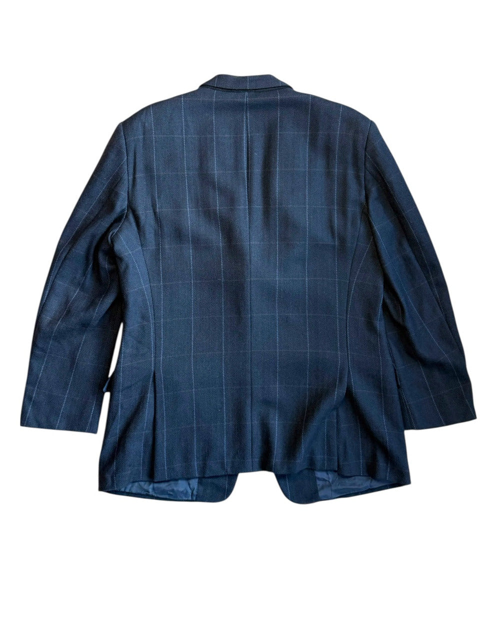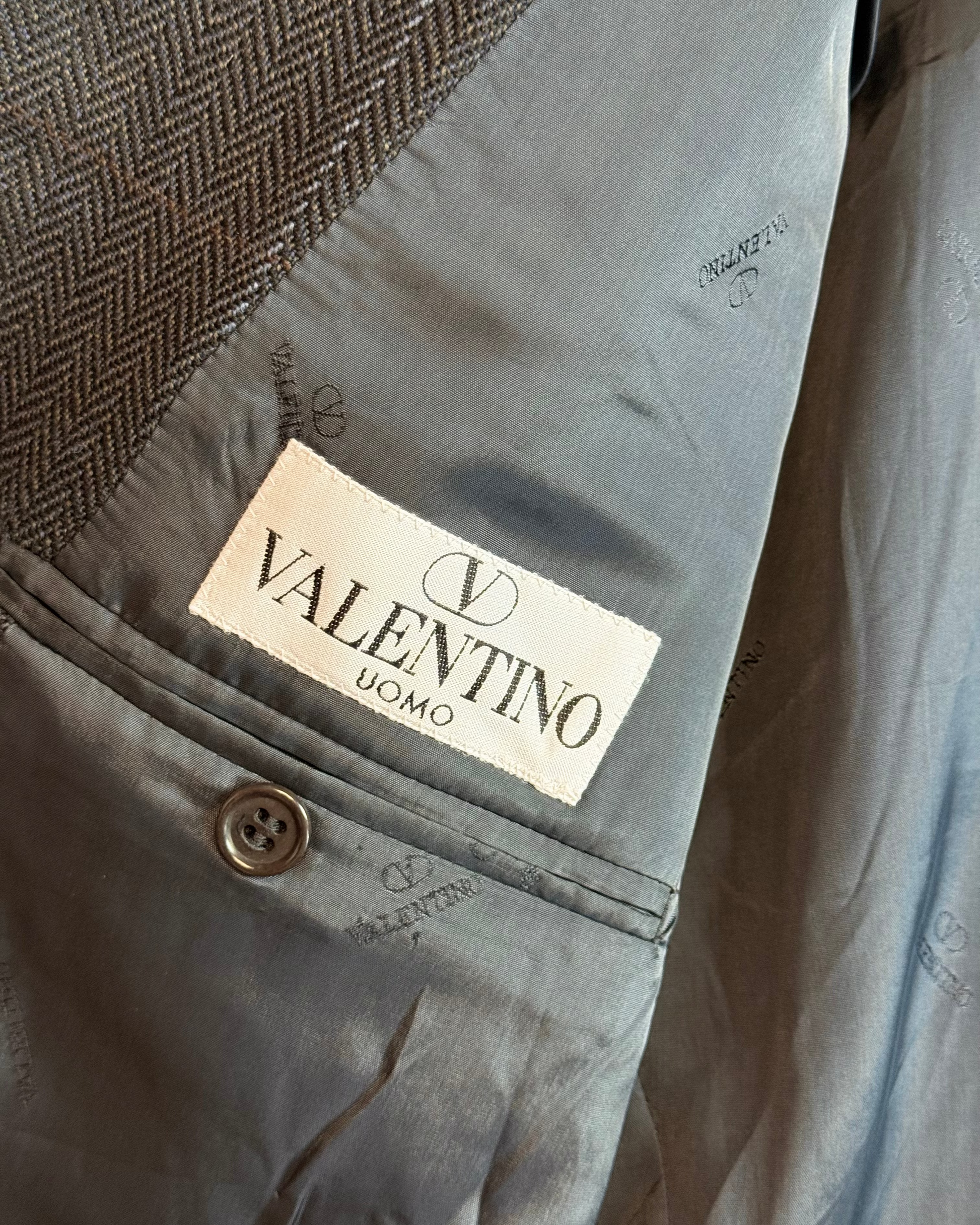Vintage Valentino Uomo blazer in a blue herringbone wool with a subtle windowpane check. The jacket has a clean two button front, structured shoulders, and a classic notch lapel. Fully lined in Valentino monogram satin with interior pockets. This piece comes from the mid nineties to early two thousands and has the refined construction typical of Valentino tailoring.