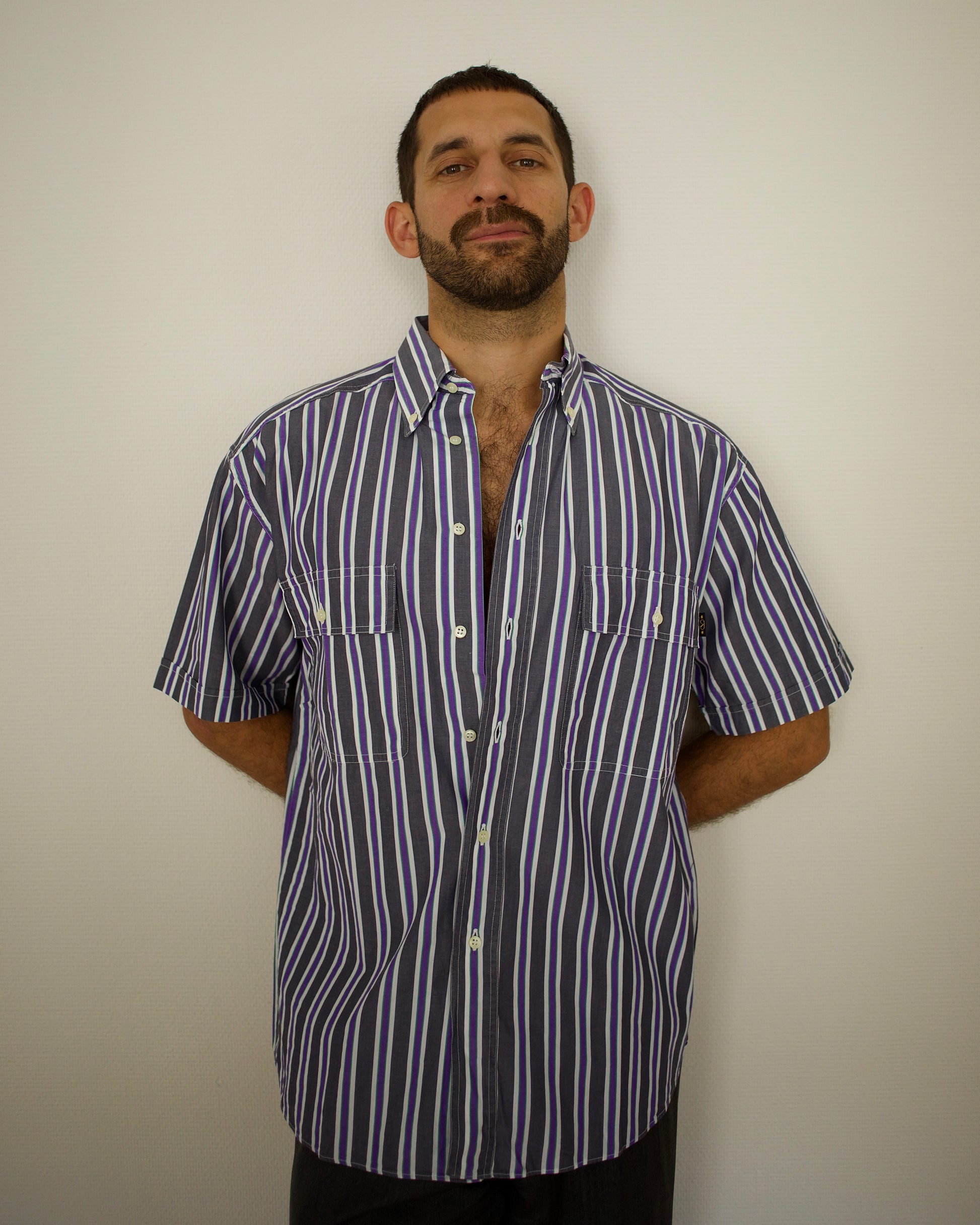 Muted grey, purple, white and green short sleeve shirt from Valentino. This 90's piece with button down collar and two chest pockets makes a versatile addition to any summer wardrobe.